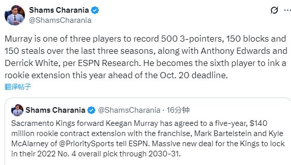名记Shams报道,基根-穆雷与国王提前续签5年1.4亿美元大合同,平均年薪接近3000万美元,据悉这份不包含球队或者球员选项;基根-穆雷目前正处在新秀合同的最后一年,他也是今夏第六位在10月20日的截止日前达成新秀提前续约合同的球员。